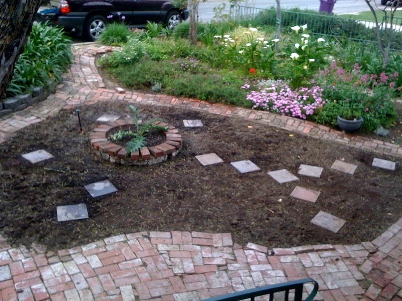 With all the ivy out, I set about the arduous task of removing roots from clay, and trying not to look at all the poor worms I chopped in half with my shovel. I had been planning on planting a small fruit tree in the center of the space to anchor it, but as I started digging up roots I realized that 12"-18" beneath the dirt was concrete. So plan B was to find something else with some height but without the root system of a tree: enter the artichoke. After adding a few bags of compost to the soil, I tired out and gave up. On with the hardscaping: a simple round raised bed (put together with extra cement pieces and bricks and filled with potting soil) and some slate tiles for stepping stones.